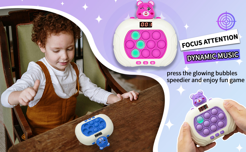 This fidget game is very convenient to carry, suitable for you to easily enjoy games anytime, anywhere indoors, outdoors or even traveling. The kids games with music and vivid sound effects, which will attract children to play continuously for hours and keep them away from TVs and computers! Besides, it is also a good helper for you to relieve work pressure!